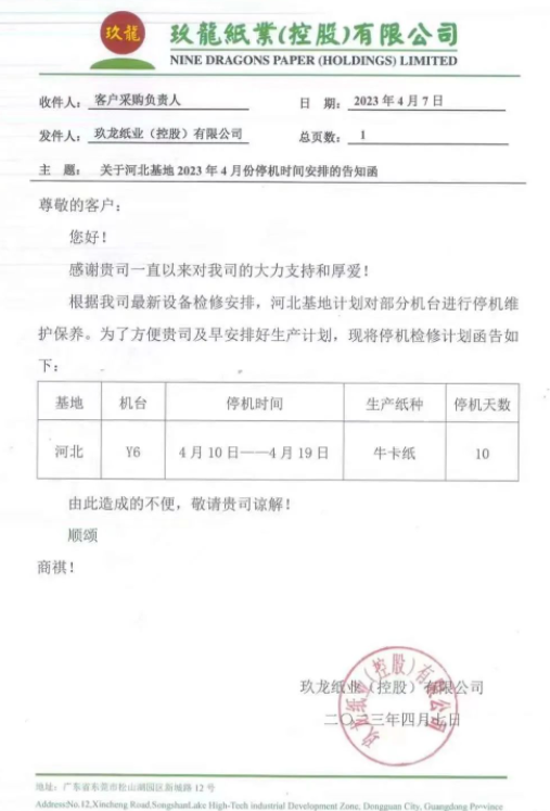 河北玖龍發(fā)布停機告知函:2023年4月10日—4月19日Y6機臺停機10天,主要生產(chǎn)牛卡紙。