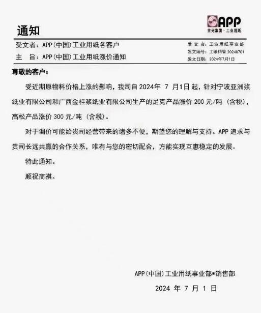 APP:受近期原物料價格上漲影響,我司自2024年7月1日起,針對寧波亞洲漿紙業有限公司和廣西金桂漿紙業有限公司生產的足克產品漲價200元/噸(含稅),高松產品漲價300元/噸(含稅)。