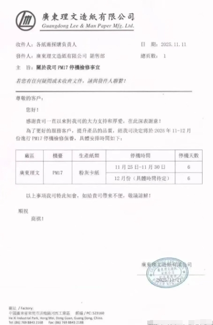 廣東理文發布停機檢修計劃(2025-11-12)