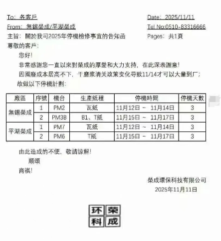 無錫榮成/平湖榮成停機檢修告知函(2025-11-12)