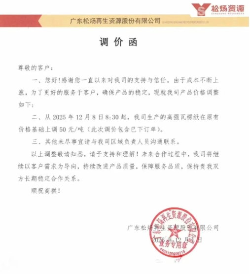 從12月8日8:30起,我司生產的高強瓦楞紙在原有價格基礎上調 50 元/噸(此次調價包含已下訂單)。