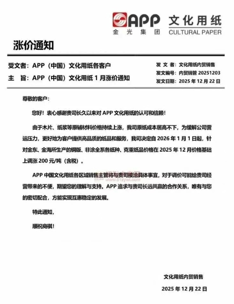 APP :由于木片、紙漿等原輔材料價格持續上漲,我司原紙成本居高不下,為緩解公司營運壓力,更好地為客戶提供高品質的紙品和服務,我司決定自2026年1月1日起,針對金東、金海所生產的銅版、非涂全系各紙種、克重紙品價格在2025 年12月價格基礎上調漲 200 元/噸(含稅)。