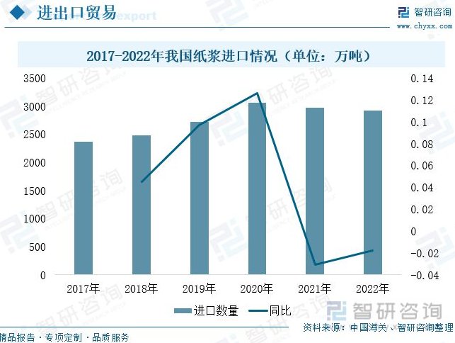 三、下游市場穩健發展,行業需求潛力巨大 下游市場對造紙設備行業發展具有重要促進作用,下游產業不斷擴張有利于本行業市場開拓與產品研發。其中,紙漿是造紙工業中最重要的原材料,紙漿生產設備品類較多,主要包括磨漿機、分切復卷機、干燥漿板機、壓縮機等多個造紙設備。2017-2022年,我國紙漿產量及消費量不斷增加。2021年我國紙漿產量及消費總量分別增長10.83%和7.94%。2022年隨著下游用紙需求不斷增加,紙漿產量及消費量延續增速,同比增速約為15%和10.85%。未來,隨著國內制漿生產線規模不斷擴大及對制漿質量要求不斷提高,紙漿制造設備需求將進一步上漲。