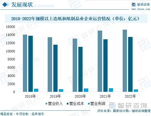 行業營業收入穩步增長。造紙行業與國民生活息息相關,2018-2022年,我國造紙行業市場規模穩步增長。2020年受新冠疫情影響,造紙行業景氣度整體處于較低水平,行業收入下降2.67%。2021年國內經濟恢復向好,我國規模以上造紙和紙制品業營業收入增長15.32%,營業利潤增長7.03%。2022年國內經濟受疫情沖擊較大,行業未來供應鏈受阻,規模以上造紙和紙制品業營業收入增速放緩,同比增長0.4%,較2021年減少14.92個百分點;利潤方面,受俄烏沖突影響,國際能源價格大幅提升,行業生產成本隨之增加,行業運行壓力較大,規模以上造紙和紙制品業營業利潤為621億元,同比下降29.80%。展望2023年,隨著“穩增長”政策落地節奏加快,市場主體活力有望被進一步激發,行業收入及利潤有望上漲。